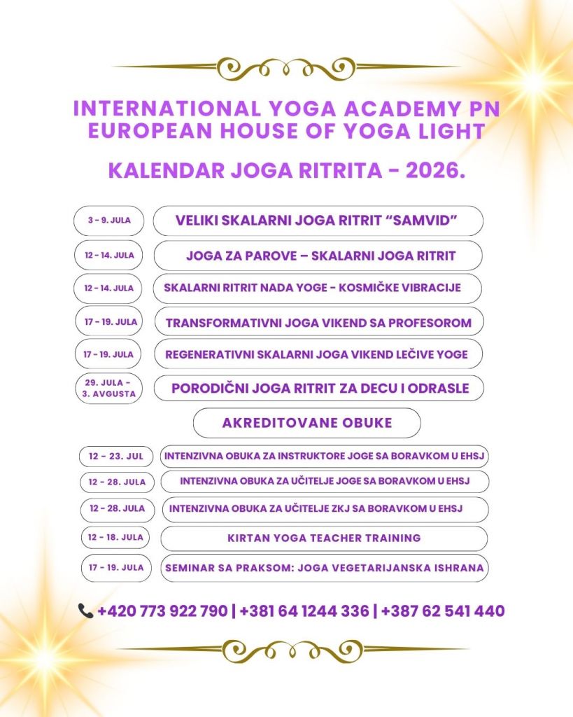EU Yoga Retreat Center – European House of Yoga Light 2025. I ove godine ćemo učestvovati u programima koje organizuje EU Yoga Retreat Center a na osnovu saradnje koju već godinama ostvarujemo sa Yoga Federation of Europe. Ove godine na raspolaganju su nam sledeći JOGA RITRITI: Regenerativni Joga Retreat, održava se od 3. do 8. juna 2025. u ašramskoj sredini Evropskog Hrama Svetlosti Joge (videti više: https://yoga-retreat.info/regenerativni-lekovita-joga) Transformativni Joga Retreat, održava se od 6. do 8. juna u ašramskoj sredini Evropskog Hrama Svetlosti Joge (videti više: https://yoga-retreat.info/transformativni-vikend-sa-profesorom) Joga Retreat “NADA JOGA“, održava se od 27. do 29. juna ašramskoj sredini Evropskog Hrama Svetlosti Joge (videti više: https://yoga-retreat.info/nada-yoga) Joga Retreat “JOGA ZA PAROVE”, održava se od 27. do 29. juna...